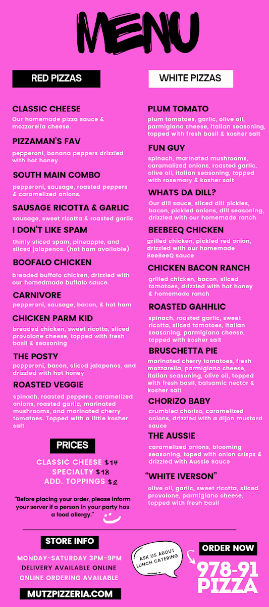 Welcome to Mutz Pizzeria, a must-visit culinary destination located at 212B S Main St, Middleton, MA. This vibrant pizzeria stands out for its eclectic menu and exceptional flavor combinations that promise an unforgettable dining experience. The menu features a delightful array of red pizzas like the spicy Pizzaman’s Fav and the hearty South Main Combo, alongside inventive white pizzas such as the unique What's Da Dill? and the savory Fun Guy.